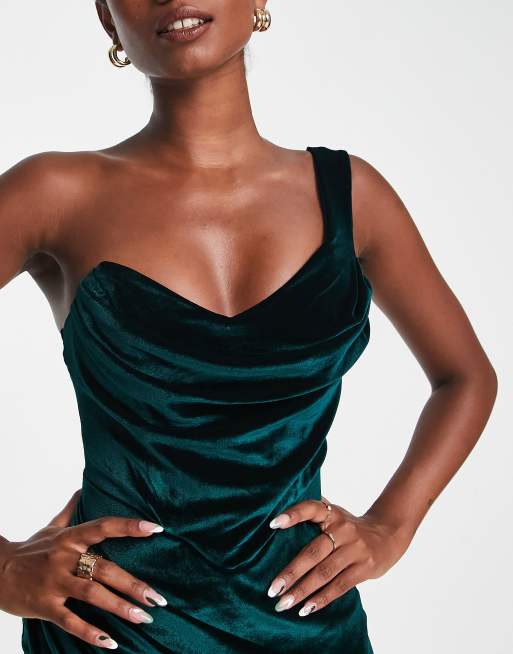 Asos Design Drapiertes Midikleid Aus Samt In Flaschengrun Mit One Shoulder Trager Und Korsettdetail Asos