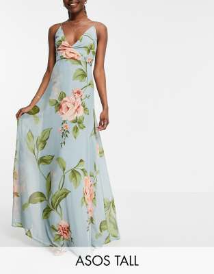 Asos Design Tall Camisole Maxikleid In Wickeloptik Mit Schnurdesign Am Rucken In Blau Mit Grossem Blumenmuster Asos